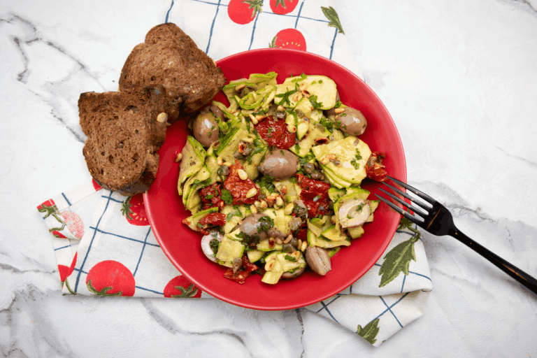 Salade de courgette grillée à la méditerranéenne, tomate séchée et pignons de pin