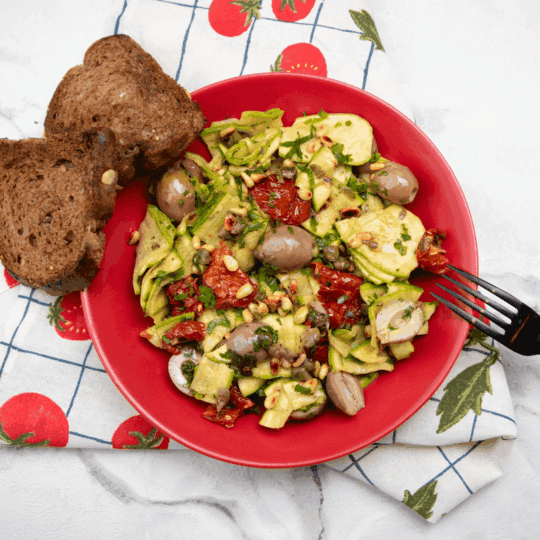Salade de courgette grillée à la méditerranéenne, tomate séchée et pignons de pin