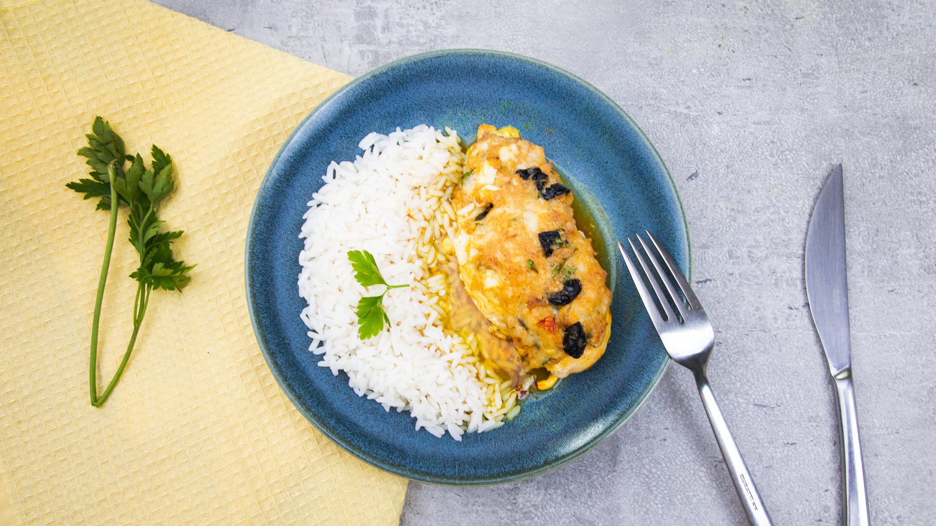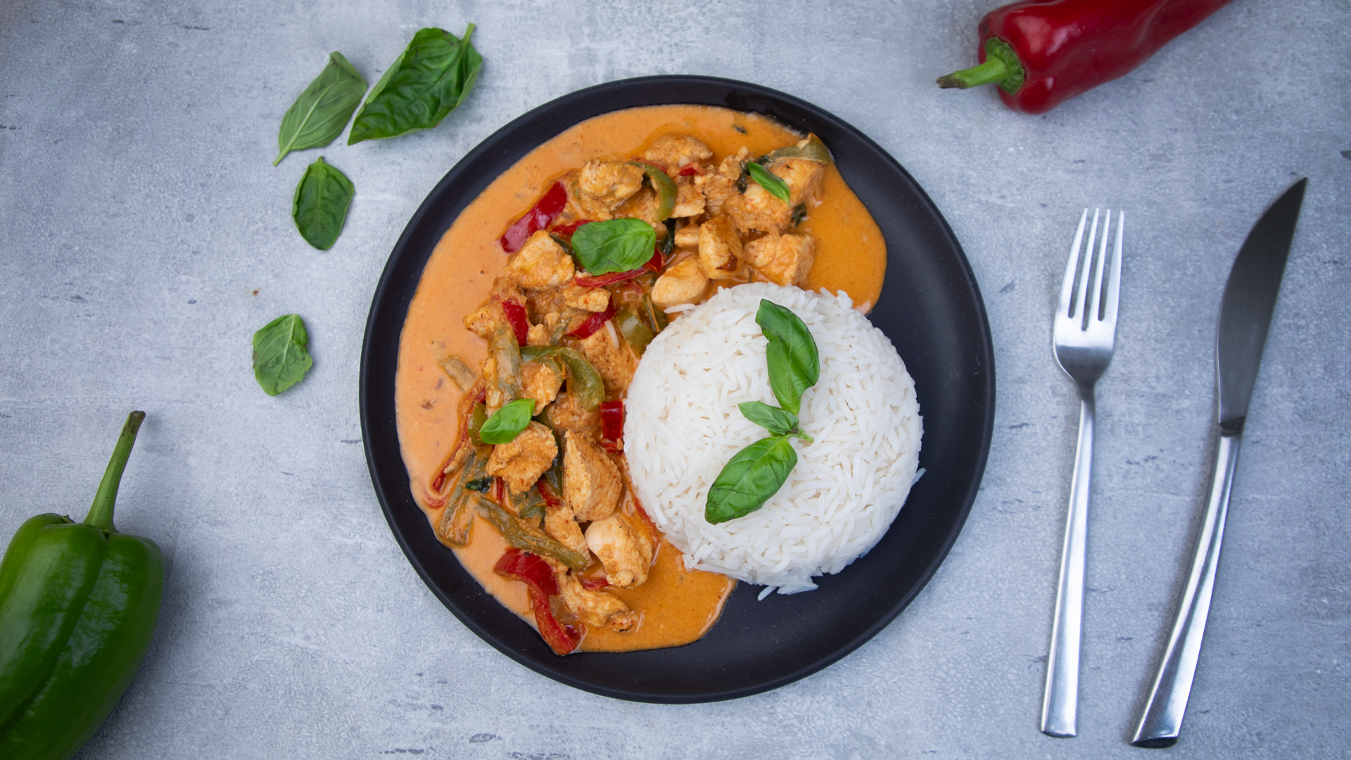 Gaeng Daeng de poulet au curry rouge, riz basmati à la noix de coco