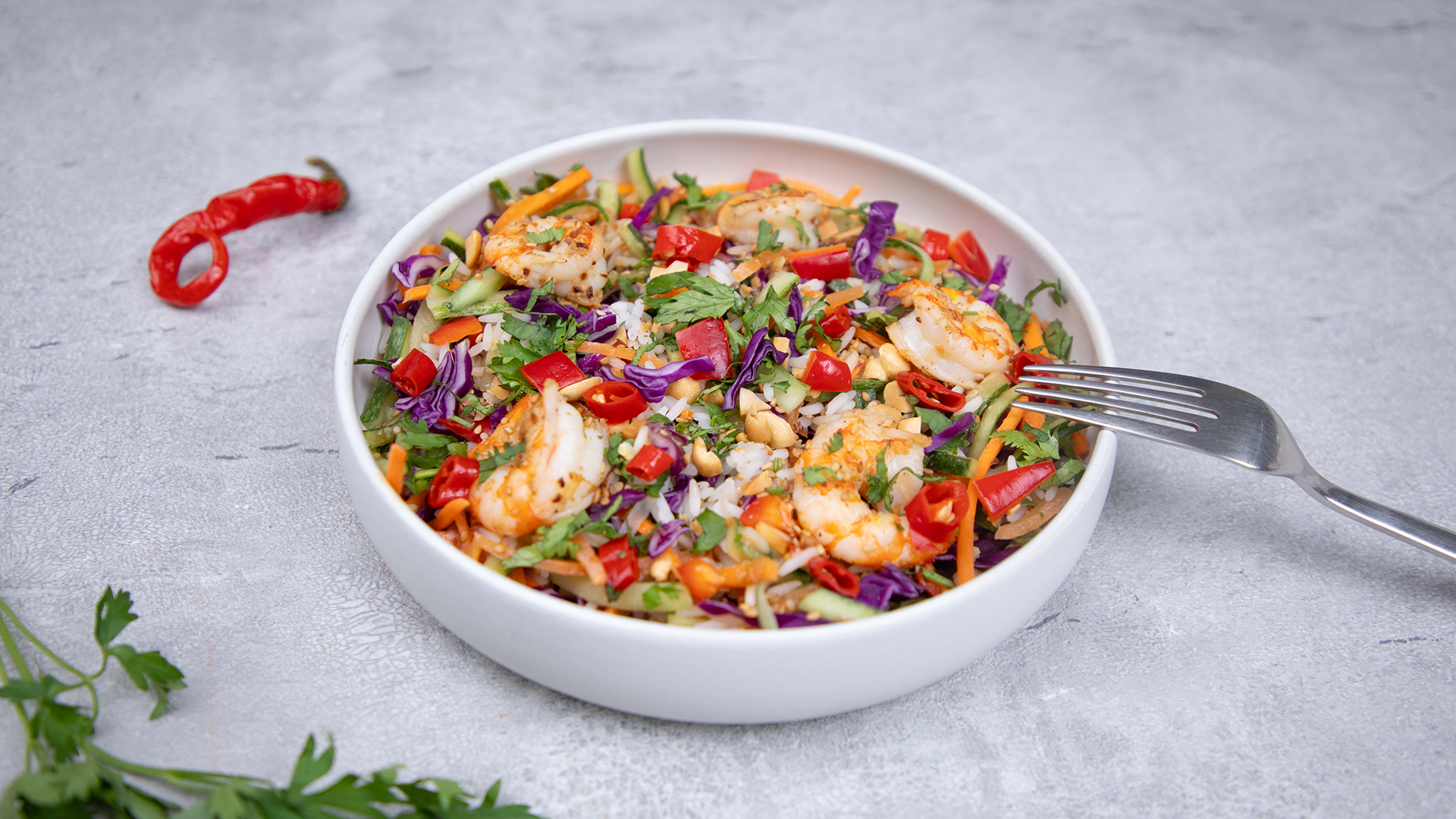 Salade de riz thaï aux crevettes et sauce cacahuète