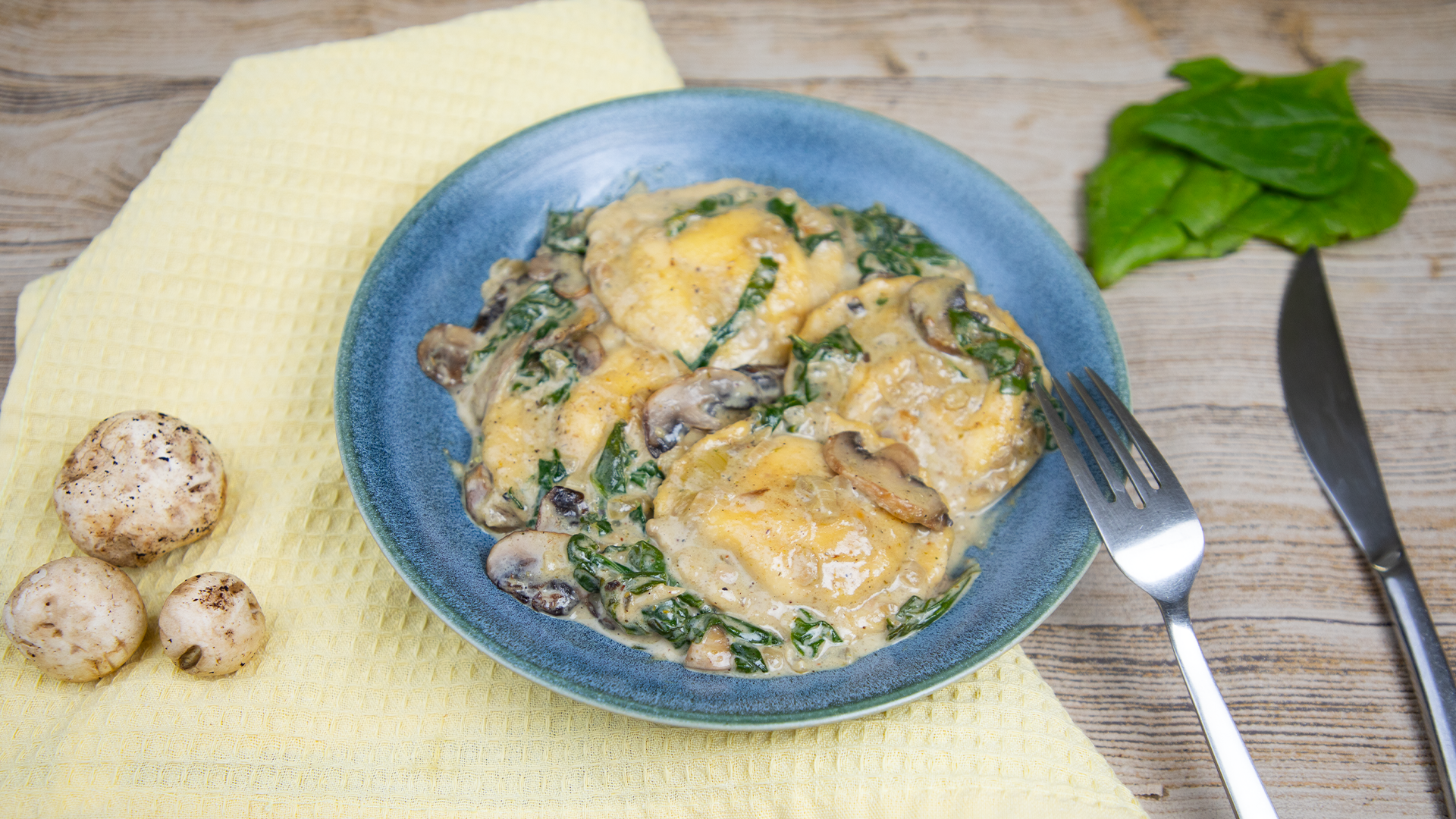 Ravioli aux 3 fromages, crème d’ail confit, épinards & champignons