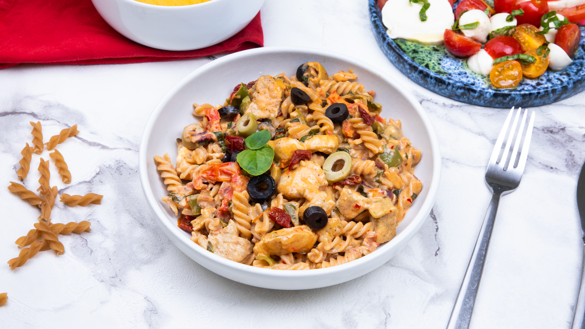 Fusilli au poulet à la Grecque, feta et tomate séchée
