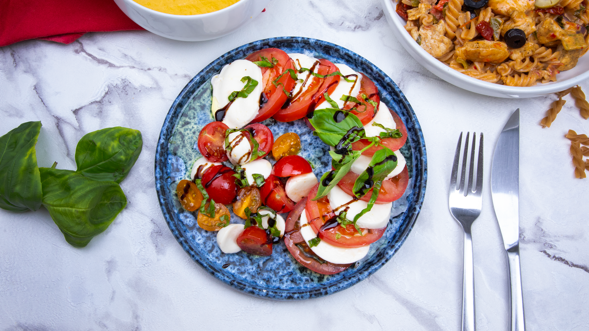 Salade Caprese, vinaigrette au basilic et crème de balsamique