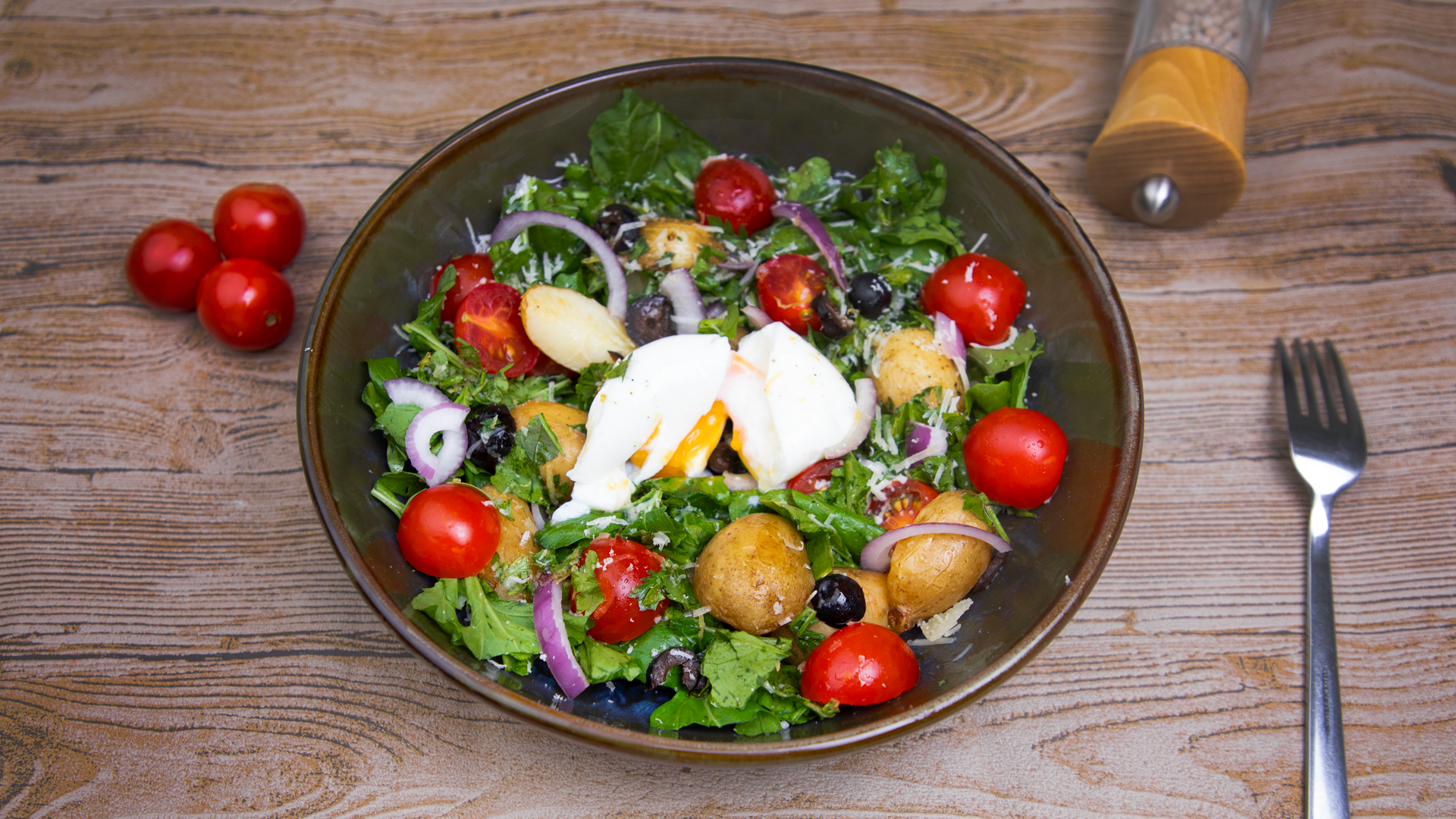Salade de pommes grenaille rôties, gremolata persillée & œuf mollet
