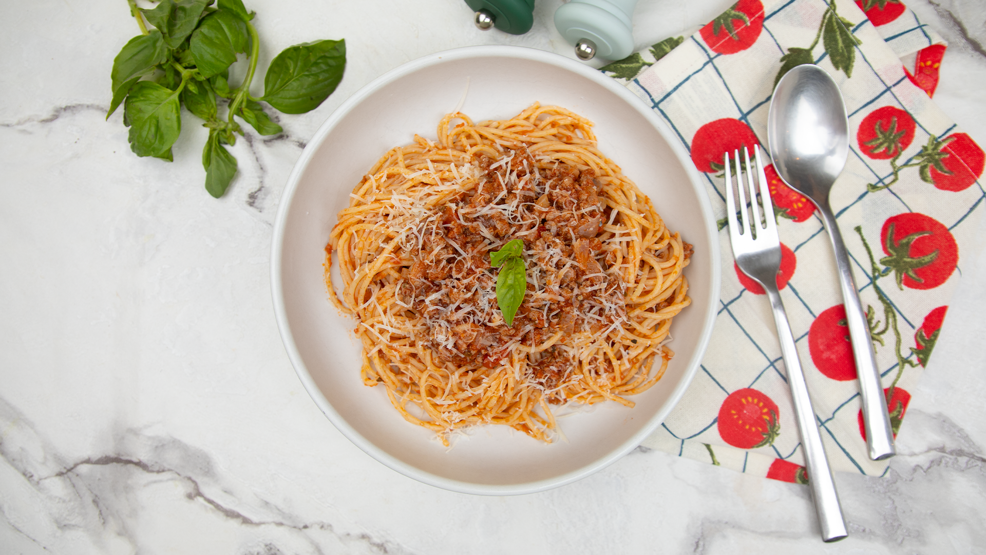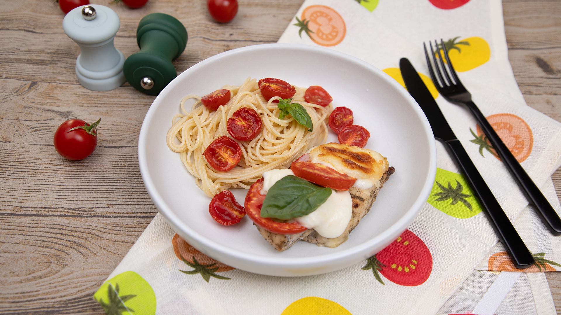 Filet de poulet façon Caprese, spaghetti aglio e olio