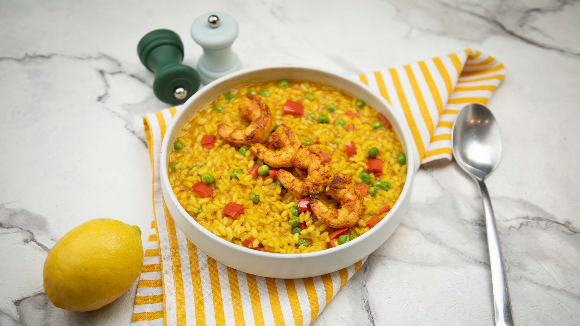 Risotto safrané aux crevettes sautées, petits pois & poivron rouge