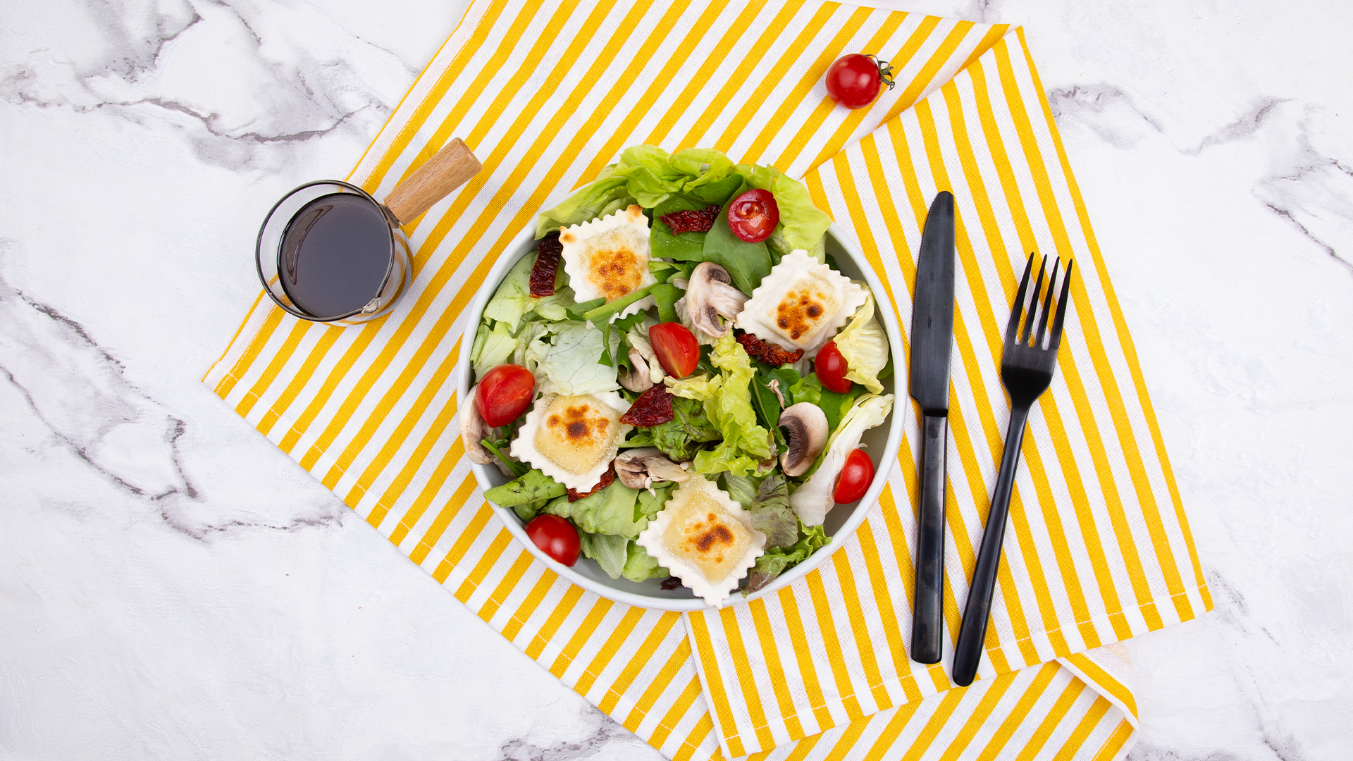 Salade forestière aux Ravioli croustillants, champignons de Paris & Pignons de Pin