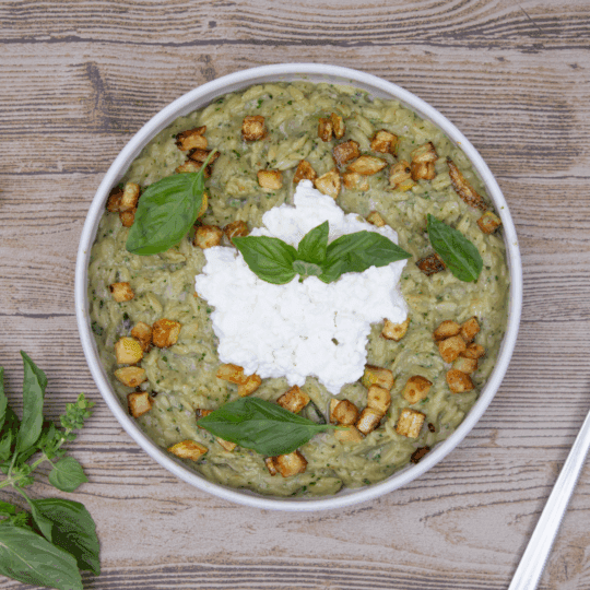 Orzotto crémeux courgette-basilic et nuage de ricotta